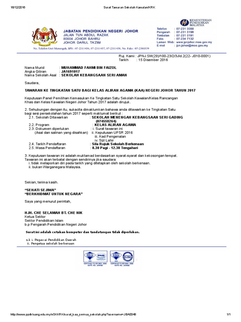 Surat Tawaran Sekolah Kawalan Krk Pdf